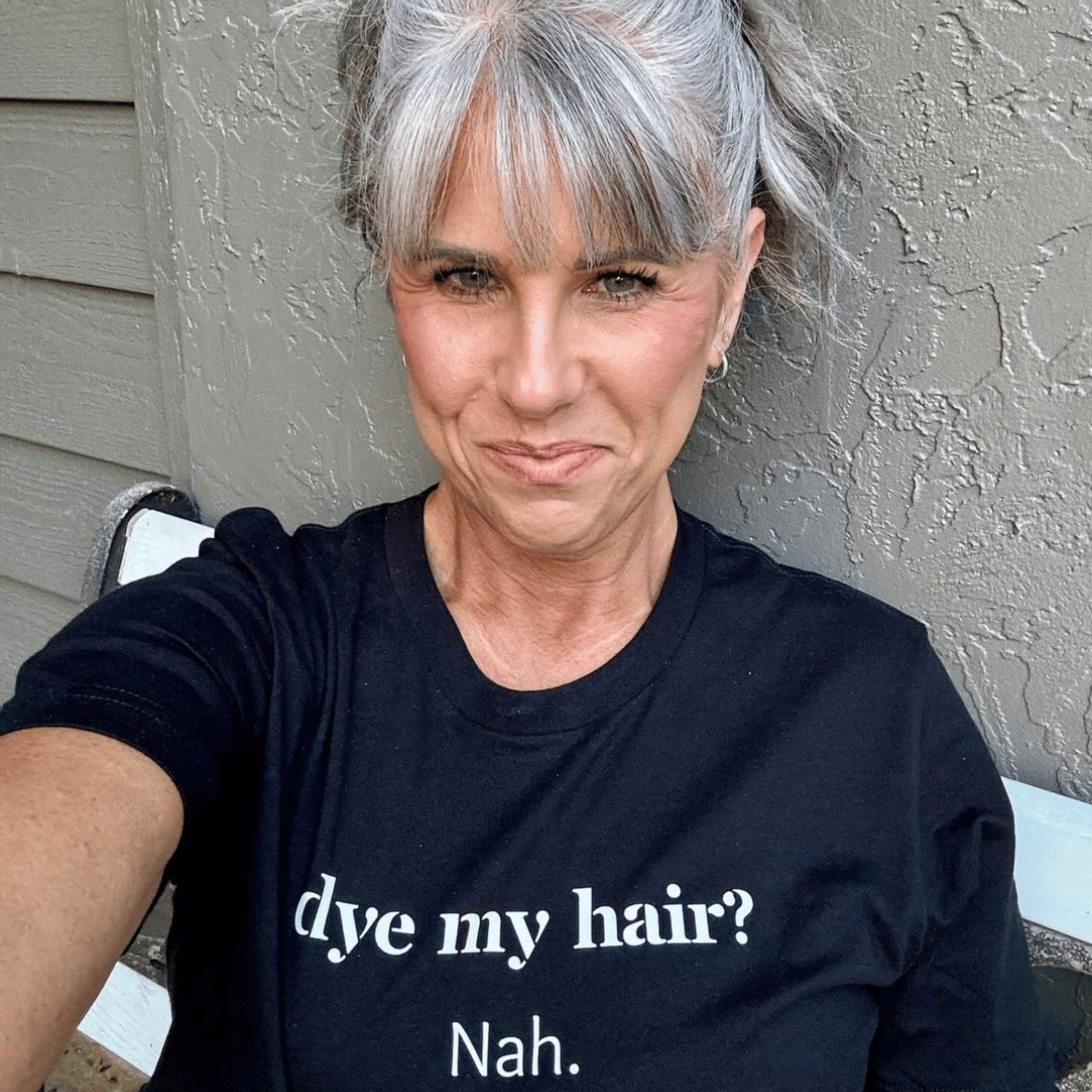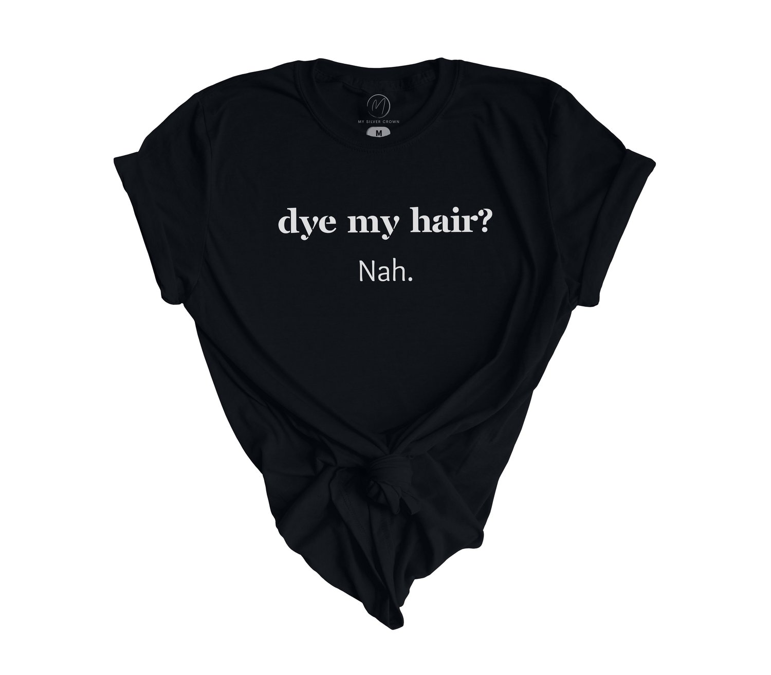The Dye My Hair? Nah t-shirt is a statement piece for women who are embracing their natural silver hair. The bold, eye-catching design prominently displays the message that you're proud of your decision to let your hair turn silver and you're not looking back.